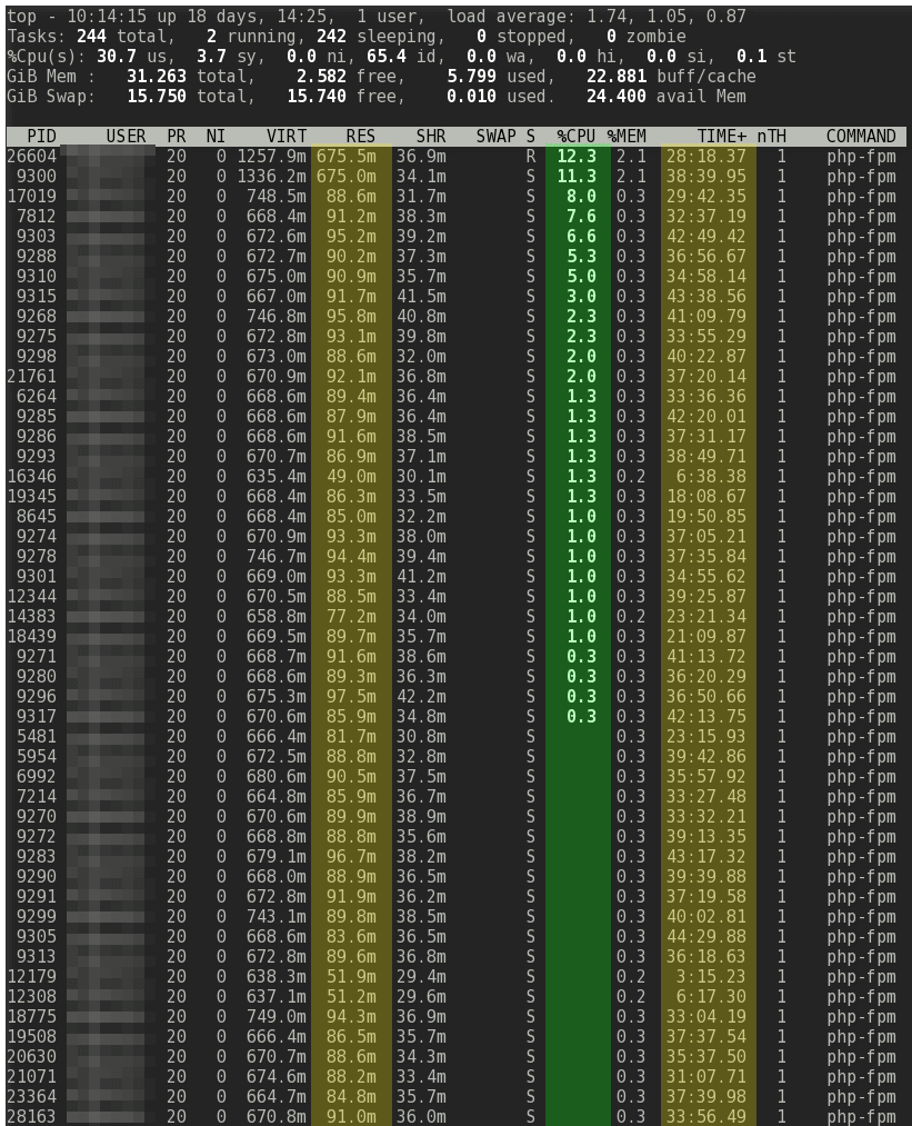 In the screenshot above, this server has pm = static and pm.max_children = 100 which uses a max of around 10GB of the 32GB installed. Take note of the self explanatory highlighted columns. During that screenshot there were about 200 ‘active users’ (past 60 seconds) in Google Analytics. At that level, about 70% of PHP-FPM children are still idle. This means PHP-FPM is always set to the max capacity of your server’s resources regardless of current traffic. Idle processes stay online, waiting for traffic spikes and responding immediately,