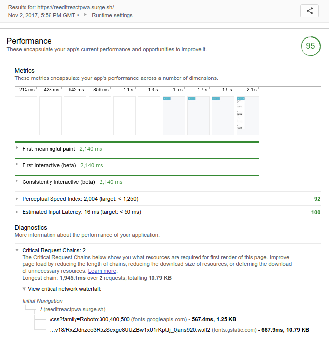 Lighthouse is an open-source tool for running audits to improve web page quality. It's integrated into Chrome's DevTools and can be also installed as a Chrome extension or CLI-based tool. It's an indispensable tool for measuring, debugging and improving the performance of modern, client-side apps (particularity PWAs).